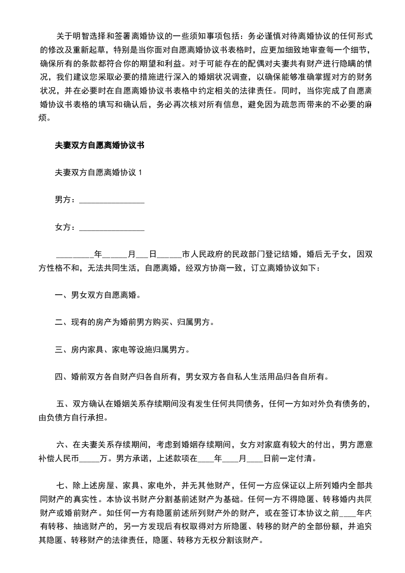 男女双方经商定,达成以下自愿离婚协议:_________________