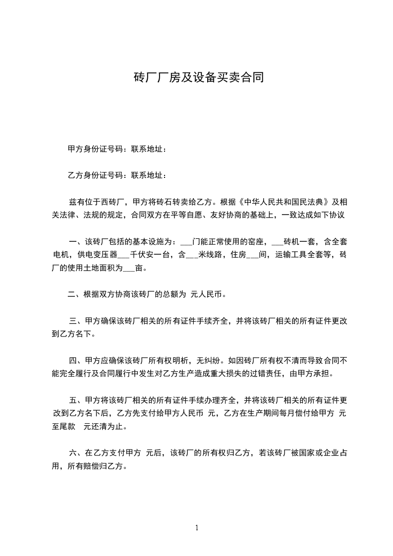 一、该砖厂包括的基本设施为:___门能正常使用的窑座,___砖机一套,含全套电机,供电变压器___千伏安一台,含___米线路,住房___间,运输工具全套等,砖厂的使用土地面积为___亩。