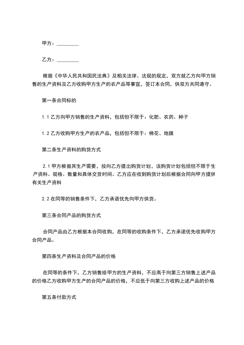 根据《中华人民共和国民法典》及相关法律、法规的规定,双方就乙方向甲方销售的生产资料及乙方收购甲方生产的农产品等事宜,签订本合同,供双方共同遵守。