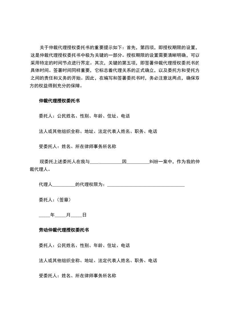 (2)授权日期。委托人:_(公民姓名、性别、年龄、住址、电话;法人或其他组织全称、地址、法定代表人姓名、职务、电话)受委托人:_(姓名、所在律师事务所名称)现委托上述委托人在我与_因_纠纷一案中,作为我的仲裁代理人。代理人_的代理权限为_委托人:_(签章)_年_月_日