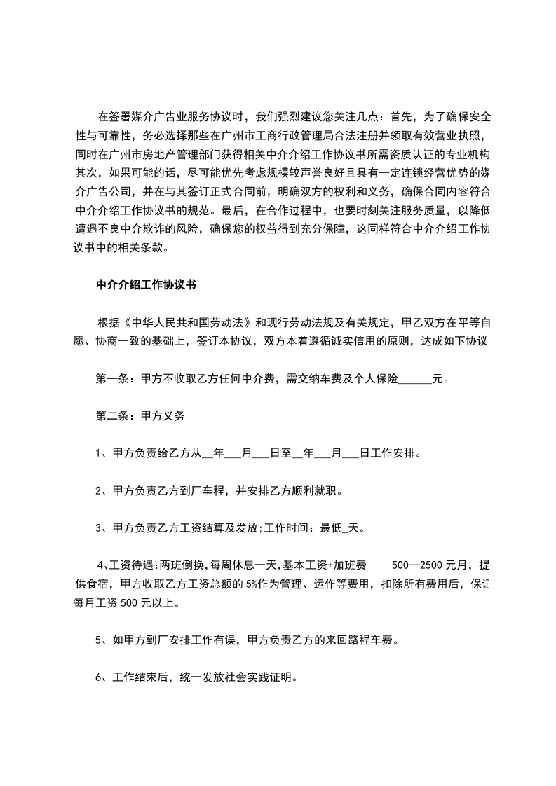 关于通过中介机构寻找工作机会的协议条款特别提醒:在签署任何相关协议之前,请务必认真审阅和理解每一个条款及其细节。尤其是在委托中介机构代为介绍工作时,所签署的中介介绍工作协议书,需要对其内容有充分了解并确认是否符合您的实际需求。在这份协议书中,对于中介机构的职服务内费用以及双方的权益等都应有明确的规定。同时,对于所授予中介机构的权利及权限,我们建议您进行适当控制,以确保不会产生不可预知的风险。其次,在申请和办理工作机会介绍过程中,我们强烈建议您能够亲自与中介机构进行沟通,以便更好地了解整个流程,降低可能存在的潜在风险。同时,如果中介机构在介绍工作过程中有任何变动或更新,他们应当及时与您沟通,并在中介介绍工作协议书中进行相应的修改和补充。最后,我们希望您能够保持警惕,避免在寻找工作机会的过程中受到不法分子的欺骗。在签署中介介绍工作协议书之前,请确保您已经充分了解并确认中介机构的信誉和服务质量,以确保您的权益得到保障。