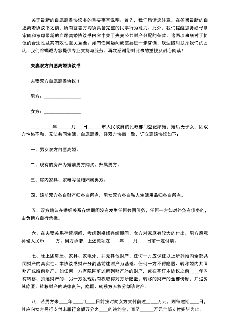 关于最新的自愿离婚协议书的重要事宜说明:首先,我们恳请您注意,在签署最新的自愿离婚协议书之前,所有签署方均须具备完整的民事行为能力。此外,我们提醒您务必仔细审阅和考虑最新的自愿离婚协议书内容中关于夫妻公共财产分配的条款。这两项事项对于协议的合法性及其有效性至关重要。如有任何疑问或需要进一步咨询,欢迎随时联系我们的团队,我们将竭诚为您提供专业支持与服务。再次感谢您对此事的重视及耐心阅读!