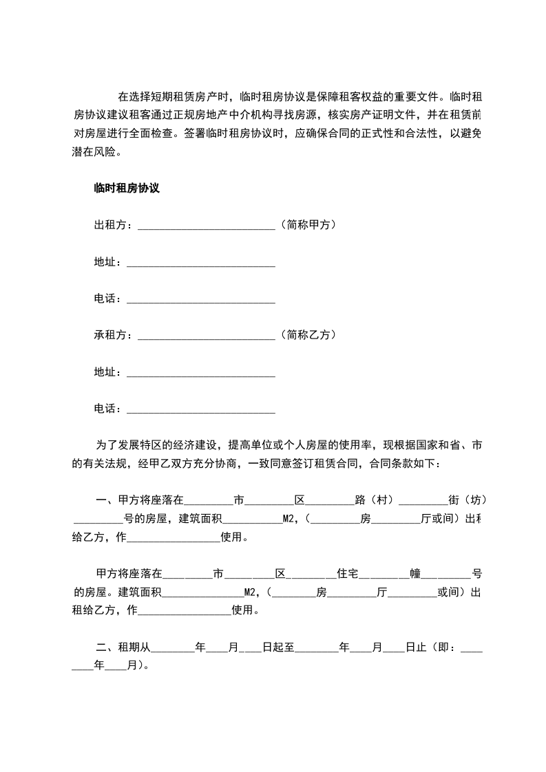 临时租房协议是租赁双方在正式签订租赁合同前的重要文件。该协议建议租户在签订合同时向房东申请3至5日的免租金期限,以便有足够时间清理和布置房屋。临时租房协议要求双方共同清点家具并记录,确保家具无损坏且功能正常。此外,协议还应规定若租户因工作调动等原因需要提前终止合同,房东应全额退还押金。临时租房协议旨在保护租户的合法权益,避免不必要的纠纷。