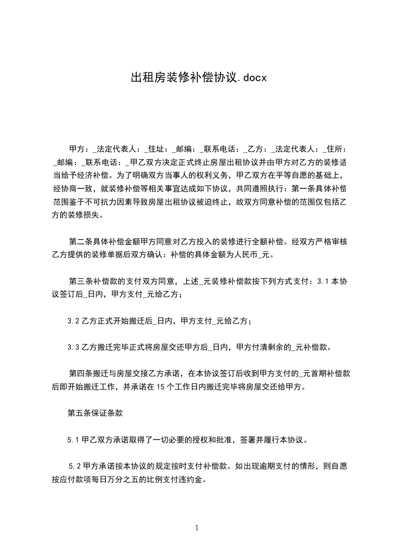 甲方同意对乙方投入的装修进行全额补偿。经双方严格审核乙方提供的装修单据后双方确认:补偿的具体金额为人民币_________元。