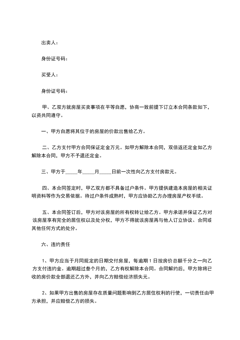 五、本合同签订后,甲方对该房屋的所有权转让给乙方。甲方承诺并保证乙方对该房屋享有完全的居住权以及处分权,甲方不得就该房屋再与他人订立协议、合同或其他任何方式的处分。