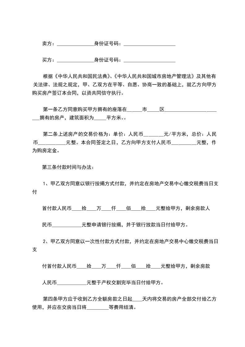 第二条上述房产的交易价格为:单价:人民币________元/平方米,总价:人民币___________元整。本合同签定之日,乙方向甲方支付人民币__________元整,作为购房定金。