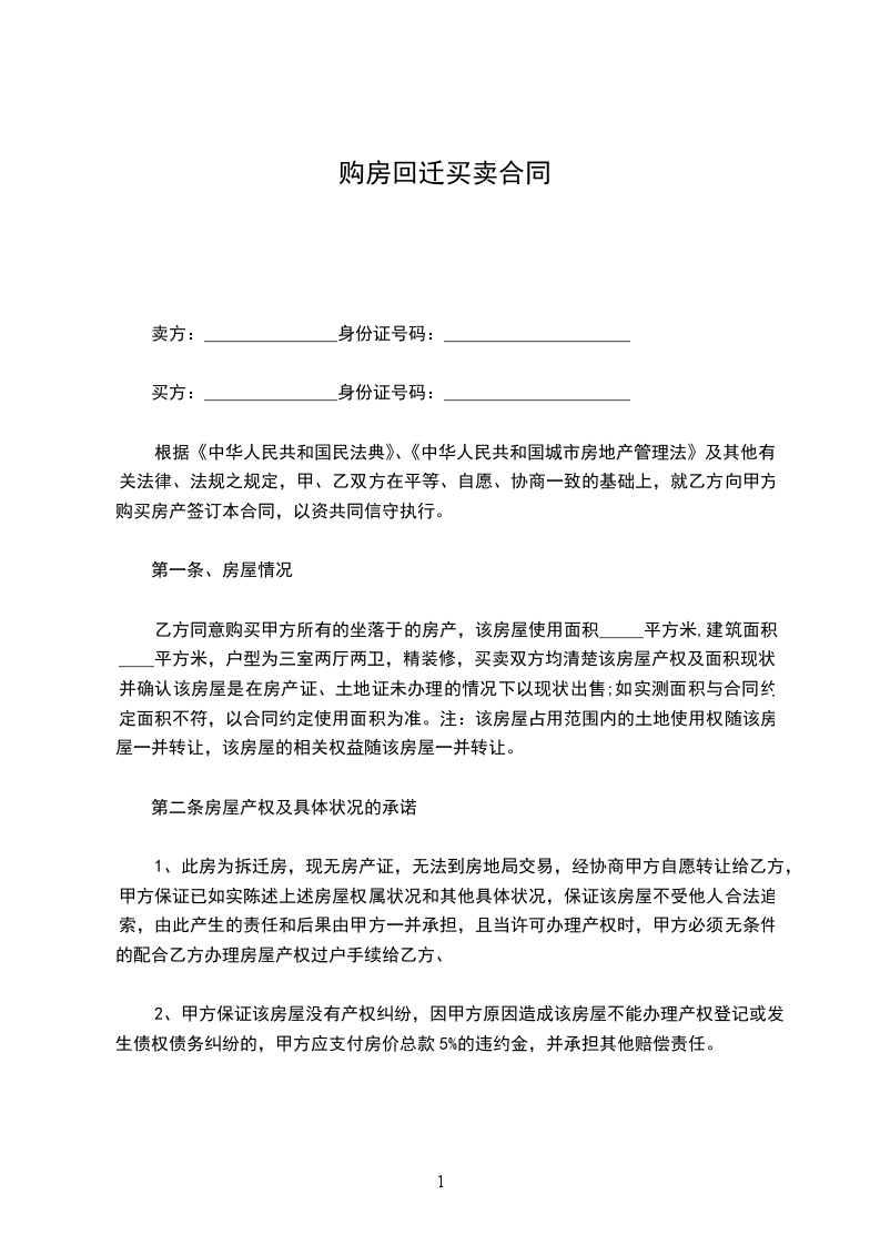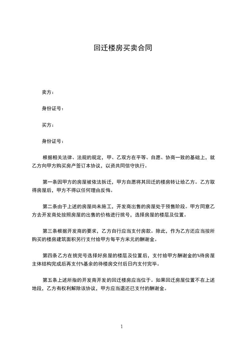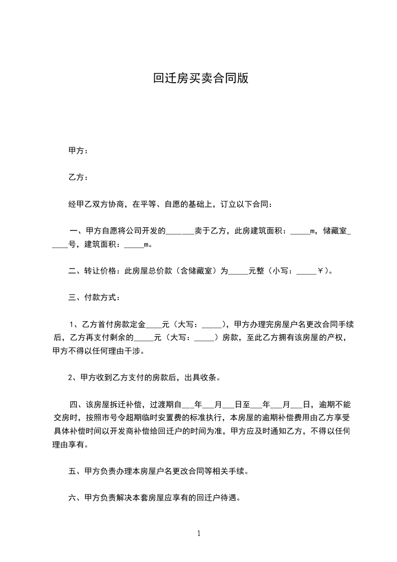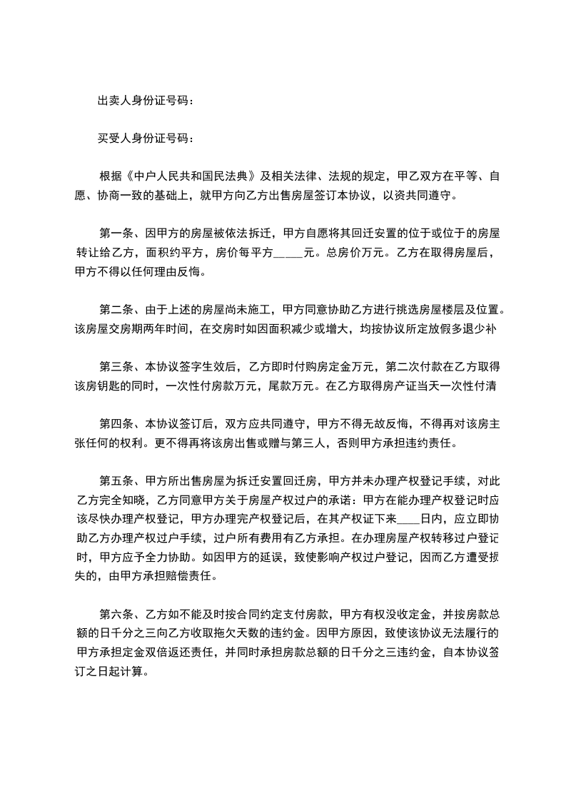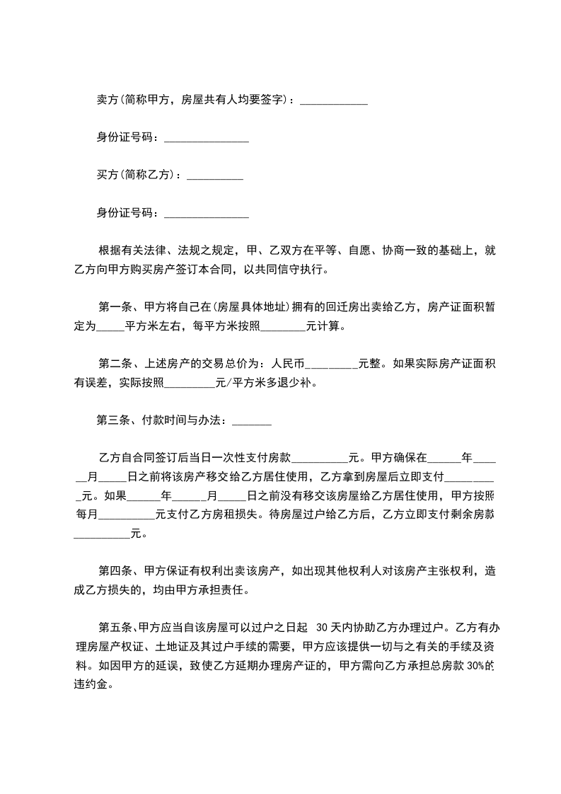 第一条、因甲方的房屋被依法拆迁,甲方自愿将其回迁安置的位于或位于的房屋转让给乙方,面积约平方,房价每平方_____元。总房价万元。乙方在取得房屋后,甲方不得以任何理由反悔。