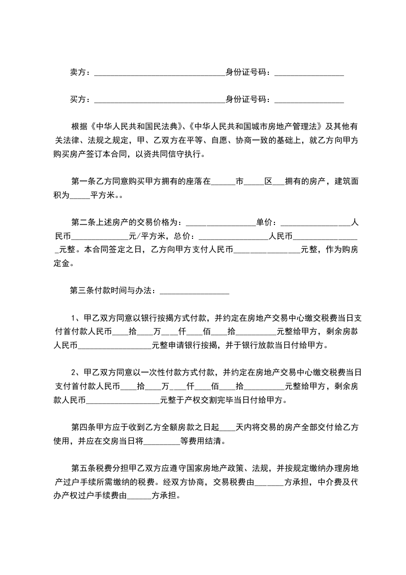 第二条上述房产的交易价格为:_________________单价:_________________人民币______________元/平方米,总价:_________________人民币_________________元整。本合同签定之日,乙方向甲方支付人民币________________元整,作为购房定金。