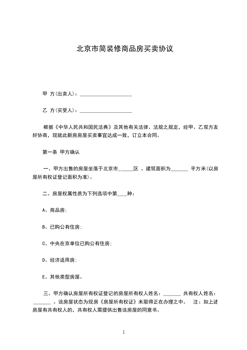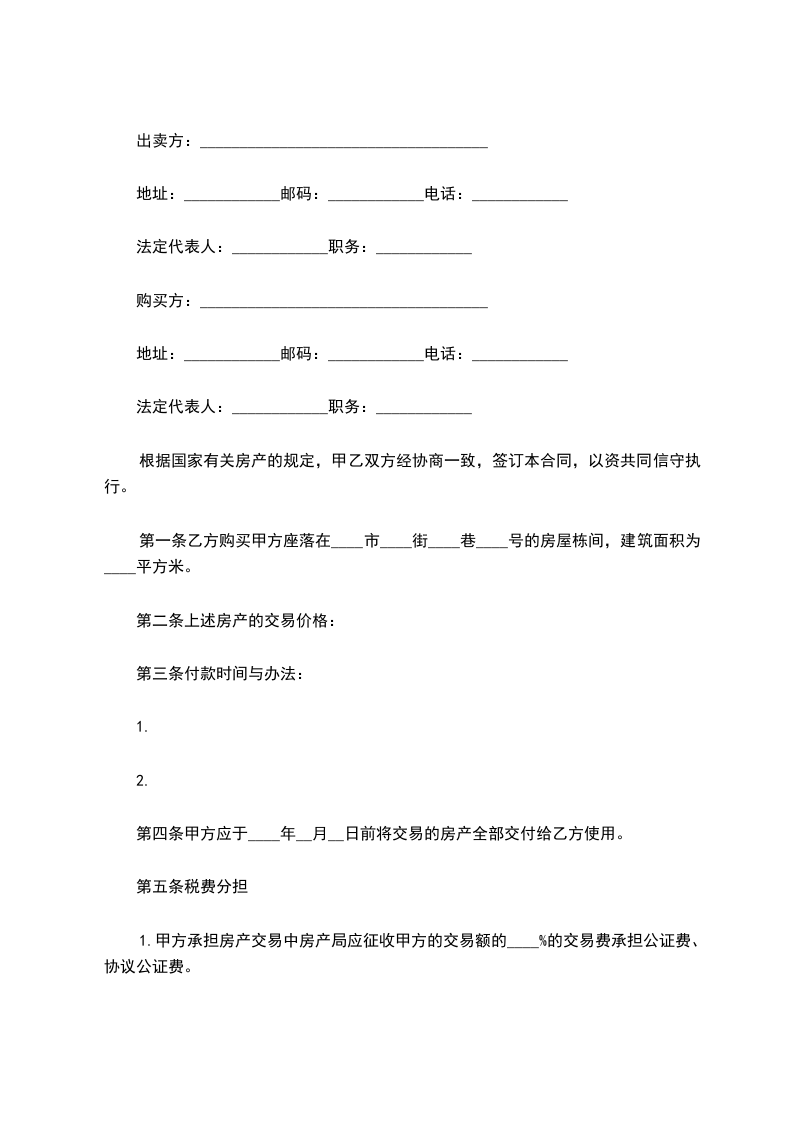 第一条乙方购买甲方座落在____市____街____巷____号的房屋栋间,建筑面积为____平方米。