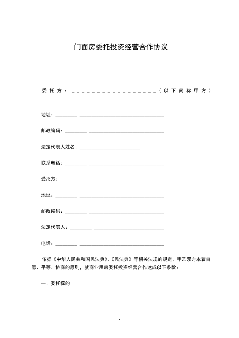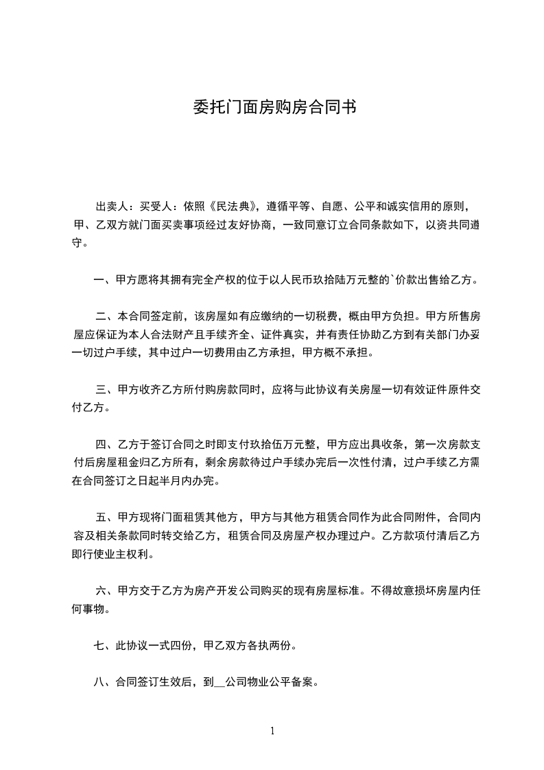 出卖人:买受人:依照《民法典》,遵循平等、自愿、公平和诚实信用的原则,甲、乙双方就门面买卖事项经过友好协商,一致同意订立合同条款如下,以资共同遵守。