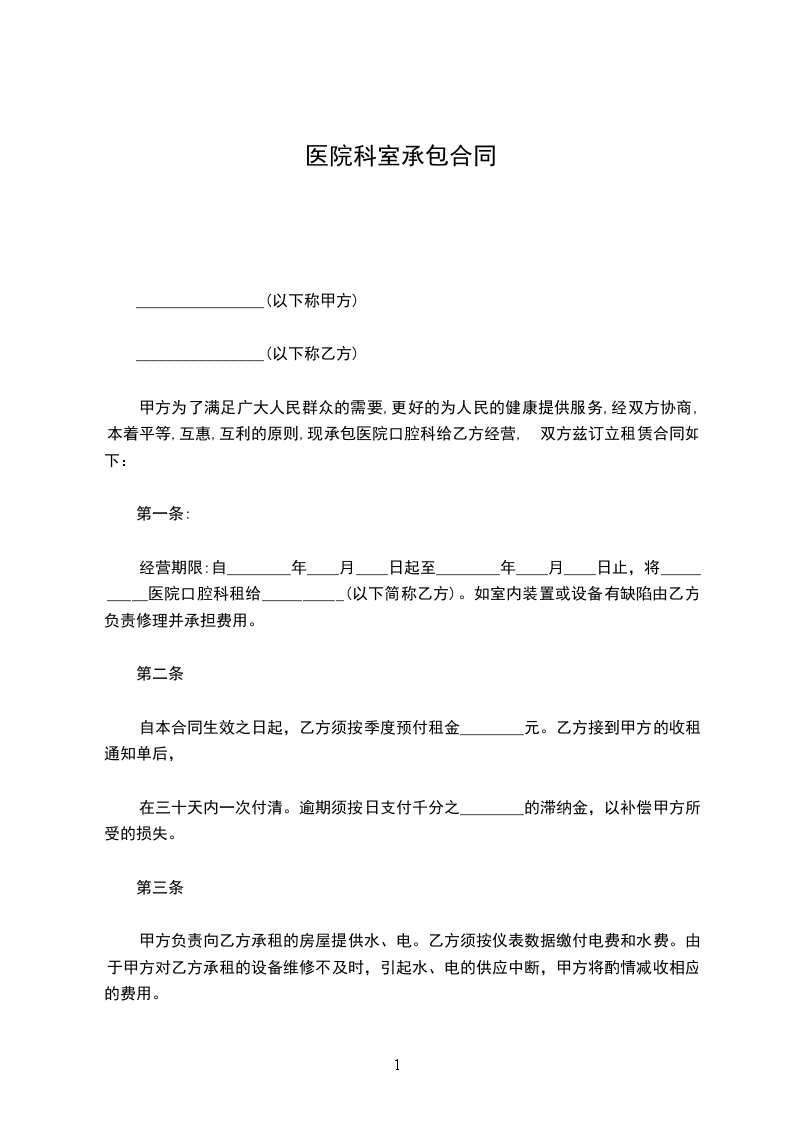 甲方为了满足广大人民群众的需要,更好的为人民的健康提供服务,经双方协商,本着平等,互惠,互利的原则,现承包医院口腔科给乙方经营, 双方兹订立租赁合同如下: