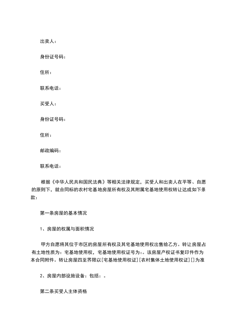 根据《中华人民共和国民法典》等相关法律规定,买受人和出卖人在平等、自愿的原则下,就合同标的农村宅基地房屋所有权及其附属宅基地使用权转让达成如下条款: