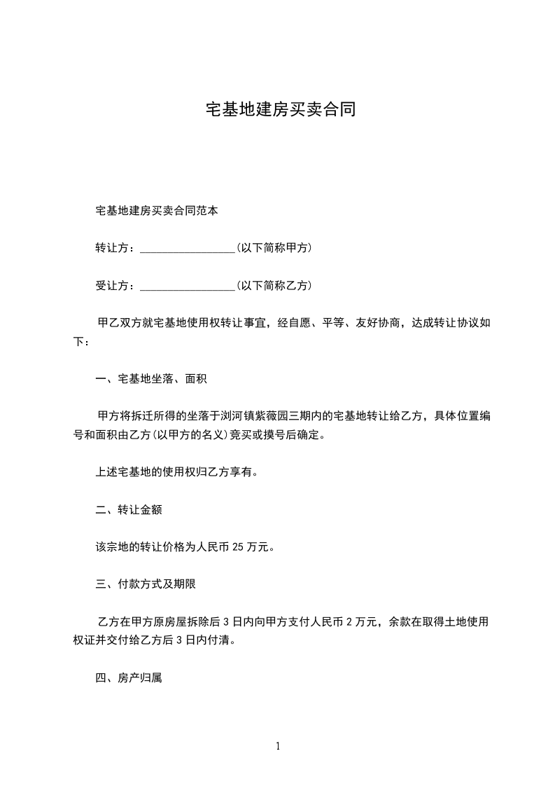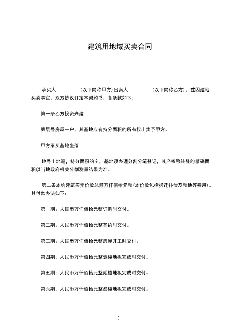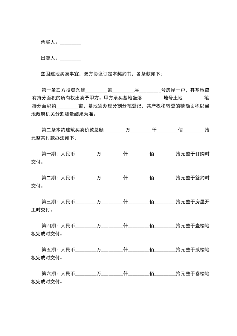 第一条乙方投资兴建_________第_________层_________号房屋一户,其基地应有持分面积的所有权出卖予甲方。甲方承买基地坐落_________地号土地_________笔,持分面积约_________亩,基地须办理分割分笔登记,其产权移转登的精确面积以当地政府机关分割测量结果为准。