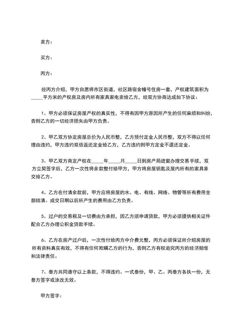 经丙方介绍,甲方自愿将市区街道,社区路宿舍幢号住房一套,产权建筑面积为_____平方米的产权房及房内所有家具家电卖给乙方,经双方协商达成如下协议: