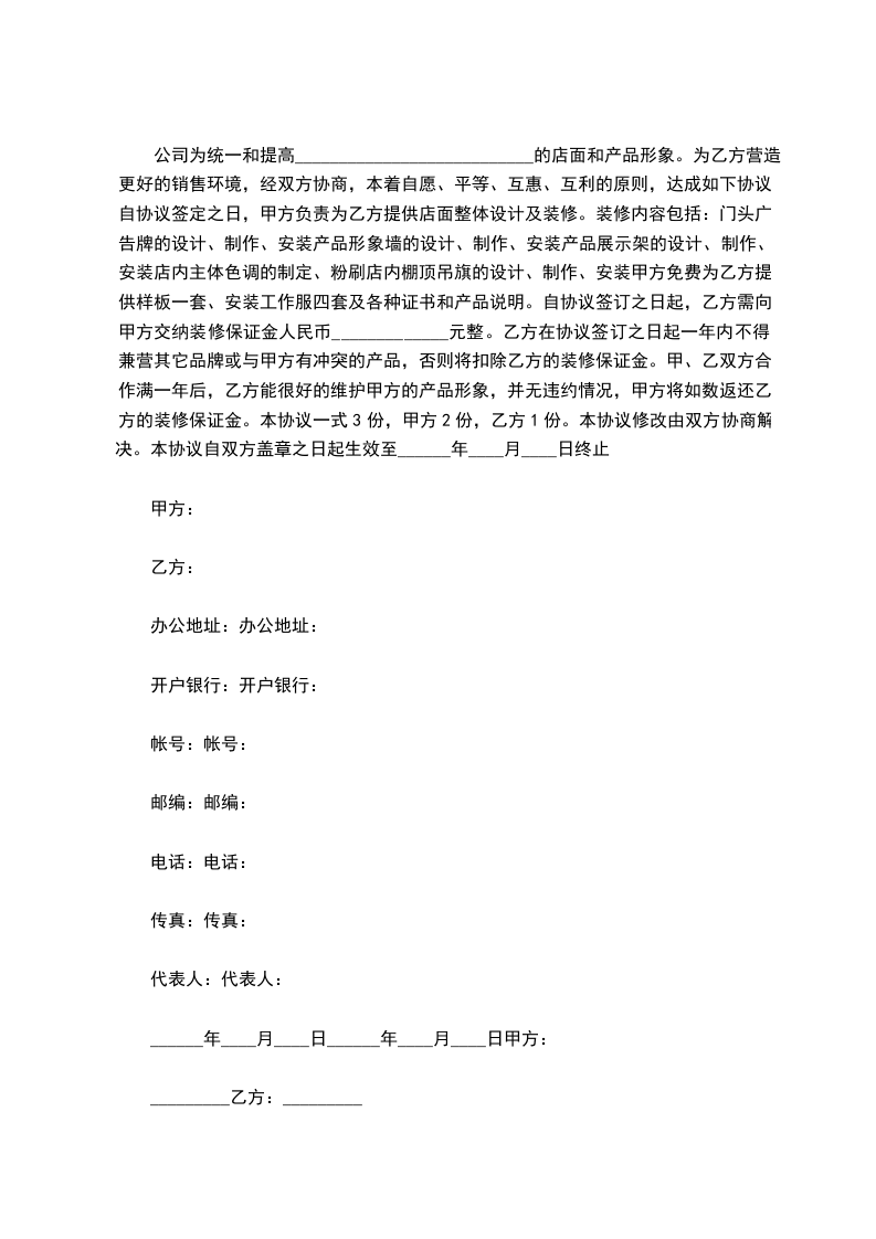 公司为统一和提高___________________________的店面和产品形象。为乙方营造更好的销售环境,经双方协商,本着自愿、平等、互惠、互利的原则,达成如下协议:自协议签定之日,甲方负责为乙方提供店面整体设计及装修。装修内容包括:门头广告牌的设计、制作、安装产品形象墙的设计、制作、安装产品展示架的设计、制作、安装店内主体色调的制定、粉刷店内棚顶吊旗的设计、制作、安装甲方免费为乙方提供样板一套、安装工作服四套及各种证书和产品说明。自协议签订之日起,乙方需向甲方交纳装修保证金人民币_____________元整。乙方在协议签订之日起一年内不得兼营其它品牌或与甲方有冲突的产品,否则将扣除乙方的装修保证金。甲、乙双方合作满一年后,乙方能很好的维护甲方的产品形象,并无违约情况,甲方将如数返还乙方的装修保证金。本协议一式3份,甲方2份,乙方1份。本协议修改由双方协商解决。本协议自双方盖章之日起生效至______年____月____日终止