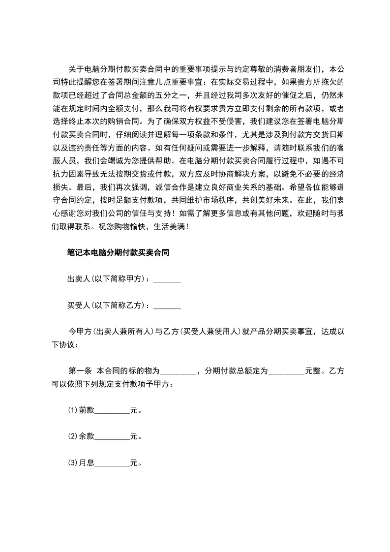 关于电脑分期付款买卖合同中的重要事项提示与约定尊敬的消费者朋友们,本公司特此提醒您在签署期间注意几点重要事宜:在实际交易过程中,如果贵方所拖欠的款项已经超过了合同总金额的五分之一,并且经过我司多次友好的催促之后,仍然未能在规定时间内全额支付,那么我司将有权要求贵方立即支付剩余的所有款项,或者选择终止本次的购销合同。为了确保双方权益不受侵害,我们建议您在签署电脑分期付款买卖合同时,仔细阅读并理解每一项条款和条件,尤其是涉及到付款方交货日期以及违约责任等方面的内容。如有任何疑问或需要进一步解释,请随时联系我们的客服人员,我们会竭诚为您提供帮助。在电脑分期付款买卖合同履行过程中,如遇不可抗力因素导致无法按期交货或付款,双方应及时协商解决方案,以避免不必要的经济损失。最后,我们再次强调,诚信合作是建立良好商业关系的基础。希望各位能够遵守合同约定,按时足额支付款项,共同维护市场秩序,共创美好未来。在此,我们衷心感谢您对我们公司的信任与支持!如需了解更多信息或有其他问题,欢迎随时与我们取得联系。祝您购物愉快,生活美满!