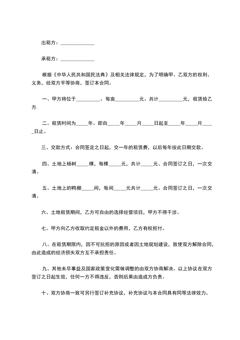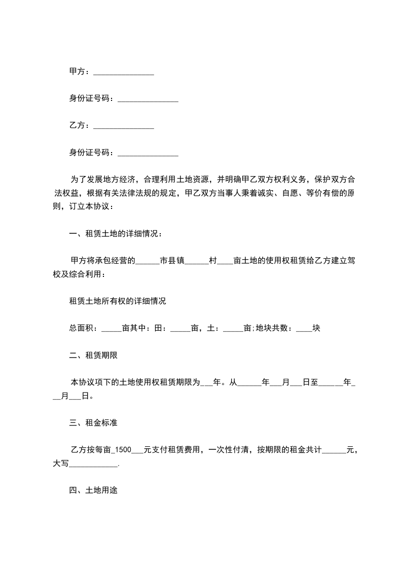 甲方将承包经营的______市县镇______村____亩土地的使用权租赁给乙方建立驾校及综合利用: