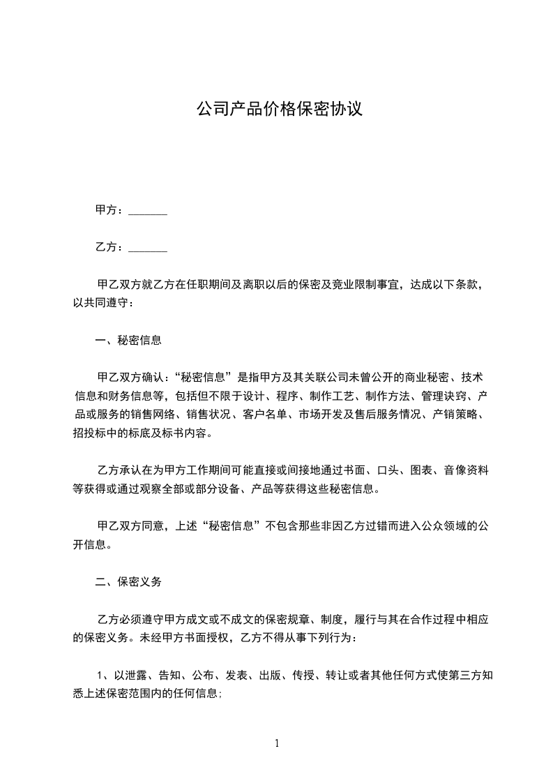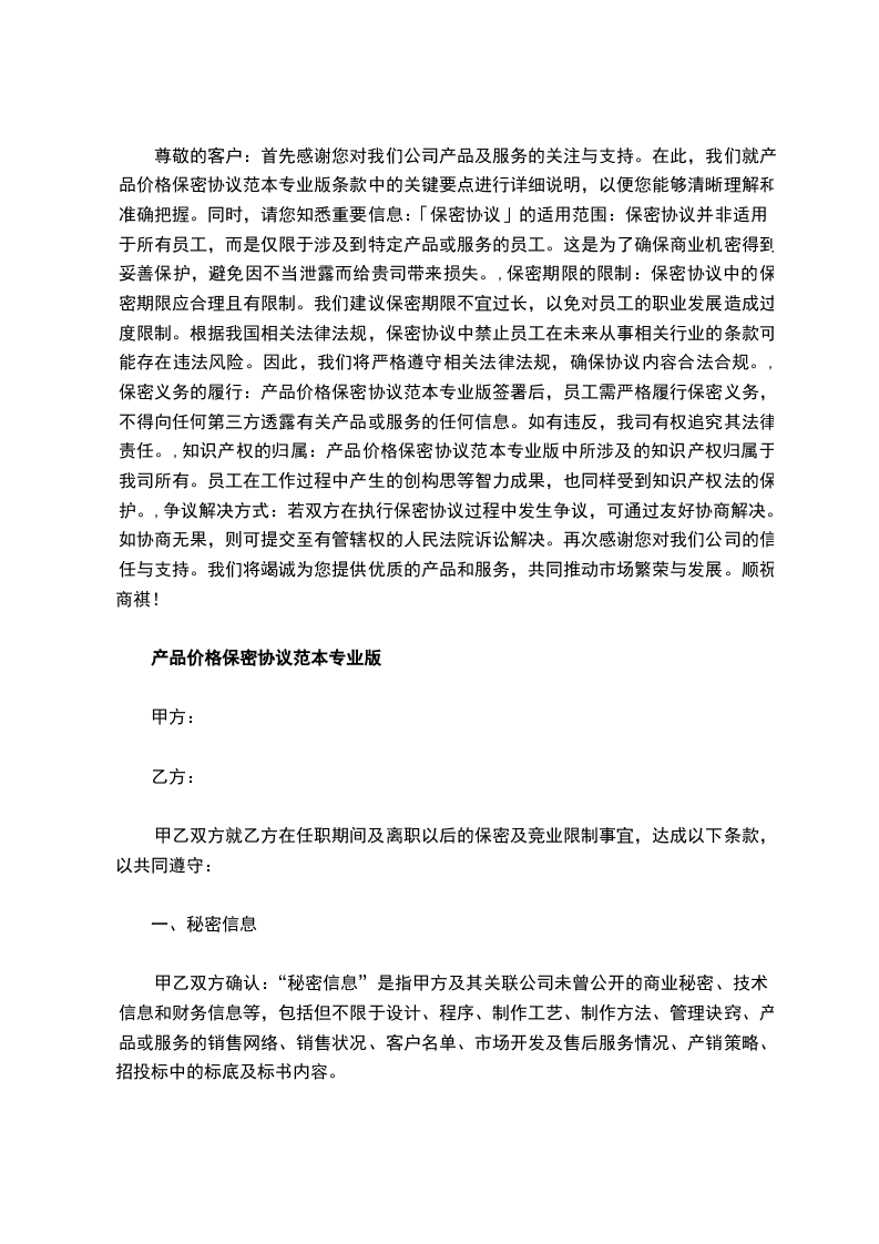 尊敬的客户:首先感谢您对我们公司产品及服务的关注与支持。在此,我们就产品价格保密协议范本专业版条款中的关键要点进行详细说明,以便您能够清晰理解和准确把握。同时,请您知悉重要信息:「保密协议」的适用范围:保密协议并非适用于所有员工,而是仅限于涉及到特定产品或服务的员工。这是为了确保商业机密得到妥善保护,避免因不当泄露而给贵司带来损失。,保密期限的限制:保密协议中的保密期限应合理且有限制。我们建议保密期限不宜过长,以免对员工的职业发展造成过度限制。根据我国相关法律法规,保密协议中禁止员工在未来从事相关行业的条款可能存在违法风险。因此,我们将严格遵守相关法律法规,确保协议内容合法合规。,保密义务的履行:产品价格保密协议范本专业版签署后,员工需严格履行保密义务,不得向任何第三方透露有关产品或服务的任何信息。如有违反,我司有权追究其法律责任。,知识产权的归属:产品价格保密协议范本专业版中所涉及的知识产权归属于我司所有。员工在工作过程中产生的创构思等智力成果,也同样受到知识产权法的保护。,争议解决方式:若双方在执行保密协议过程中发生争议,可通过友好协商解决。如协商无果,则可提交至有管辖权的人民法院诉讼解决。再次感谢您对我们公司的信任与支持。我们将竭诚为您提供优质的产品和服务,共同推动市场繁荣与发展。顺祝商祺!