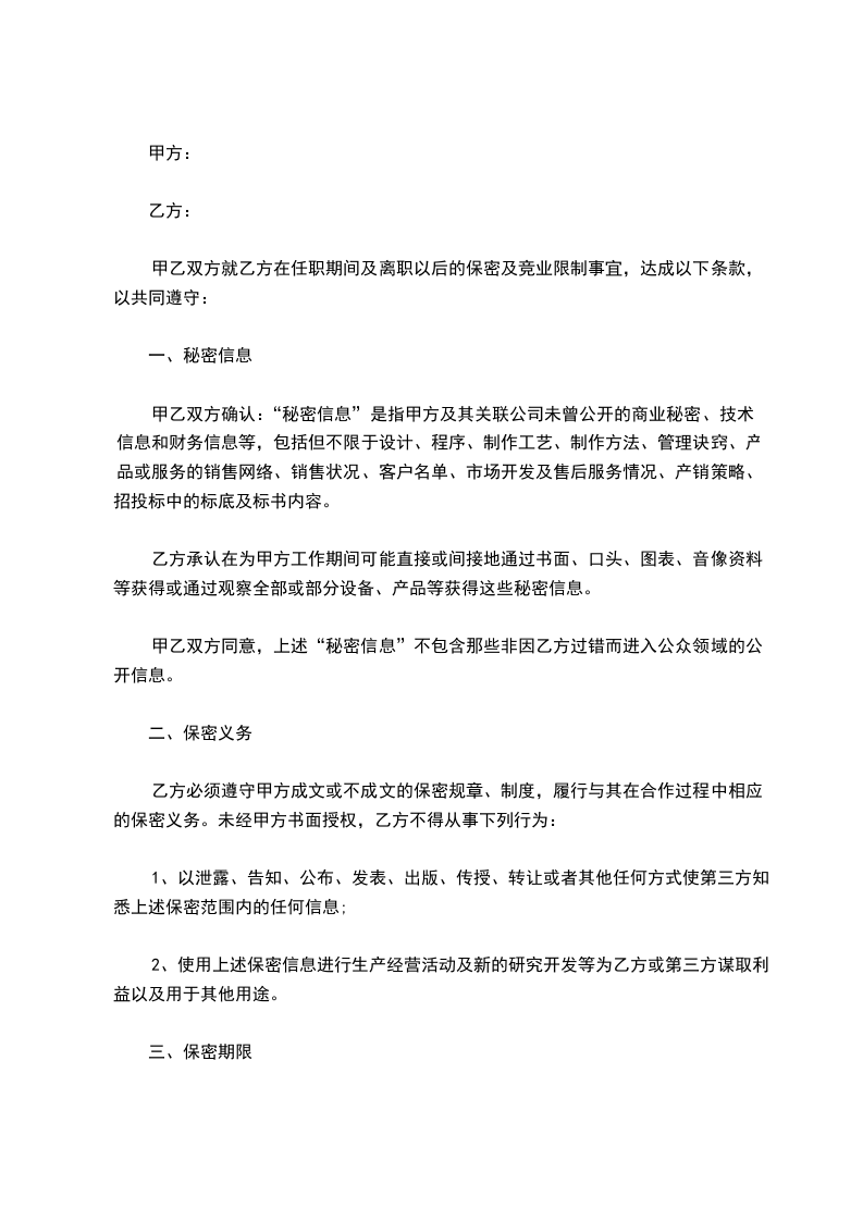 甲乙双方就乙方在任职期间及离职以后的保密及竞业限制事宜,达成以下条款,以共同遵守: