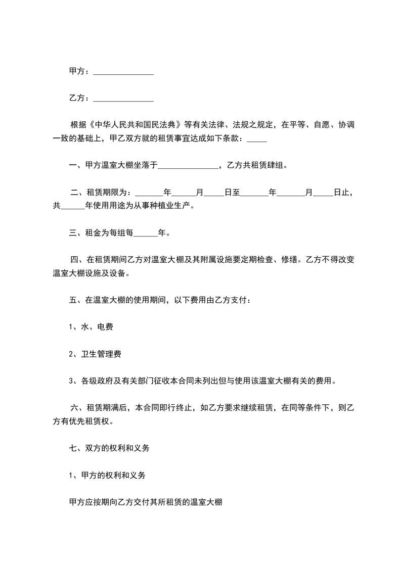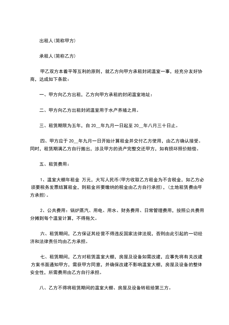 四、在租赁期间乙方对温室大棚及其附属设施要定期检查、修缮。乙方不得改变温室大棚设施及设备。