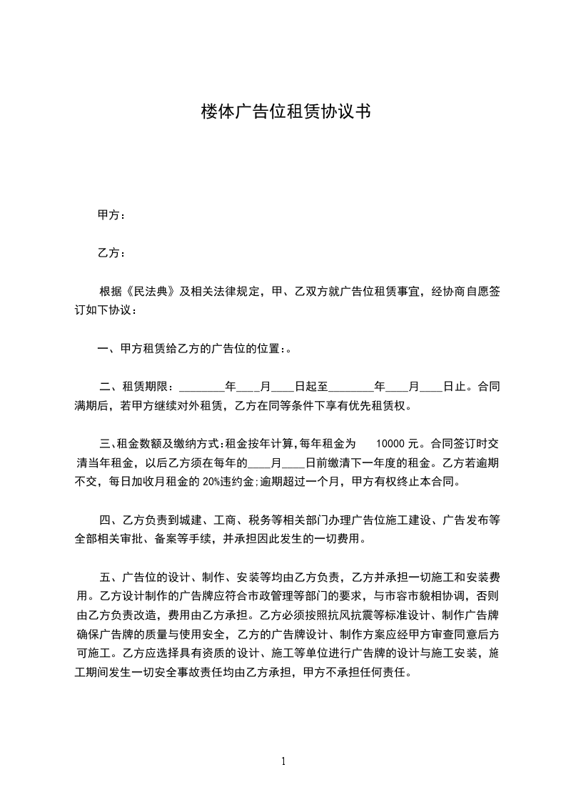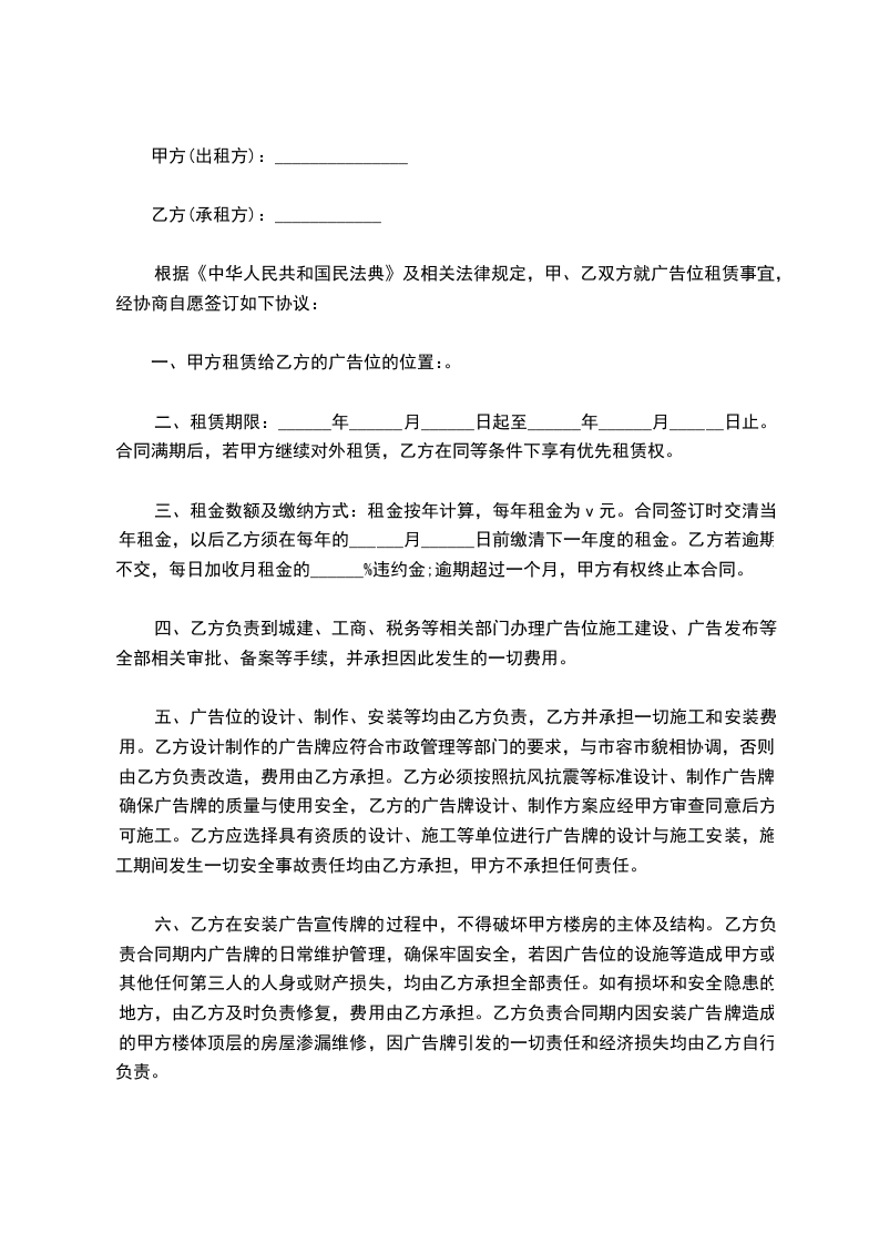根据《中华人民共和国民法典》、《中华人民共和国广告法》及其他法律、法规之规定,在平等、自愿、协商一致的基础上,甲乙双方就本广告位的租赁达成如下协议: