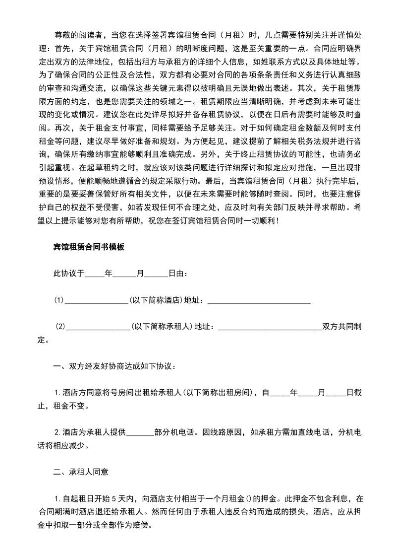 尊敬的客户,您好!兹有我司提供关于宾馆租赁合同(月租)的重要注意事项,希望在您签署合同时予以高度重视。首先,我们将详细说明租赁期限的相关问题,让每一个细节都清晰明了。,租赁期限的明确规定:在签订宾馆租赁合同(月租)之前,请务必仔细阅读并理解其中的所有条款。特别是关于租赁期限的部分,我们建议您与我方共同确认租赁期限的起始日期以及截止日期,以避免可能出现的误解或争议。,续租及终止的明确约定:为了确保租赁关系的稳定性,我们强烈建议您在合同中明确约定续租和终止的条件和程序。这不仅可以帮助您更好地规划未来的经营策略,也能为我们双方提供更加稳定可靠的合作环境。,其他重要条款:除了上述两个关键点之外,还有许多其他条款需要您关注。例如,租金支付方押金退还政维修责任划分等等。这些内容对于维护您的合法权益至关重要,因此我们强烈建议您在签署合同时认真阅读并理解每一项条款。,法律效力:最后,我们要强调的是,宾馆租赁合同(月租)具有法律约束力。一旦您签署了这份合同,就意味着您已经接受了其中的所有条款和条件。如果您对某些条款存在疑问或者不满意,我们鼓励您及时向我们提出,以便我们能够协商解决。总之,我们希望通过以上提示,能够帮助您顺利完成宾馆租赁合同的签署工作。如有任何疑问或需要进一步咨询,欢迎随时联系我们。我们期待着与您建立长期稳定的合作关系,共创美好未来!