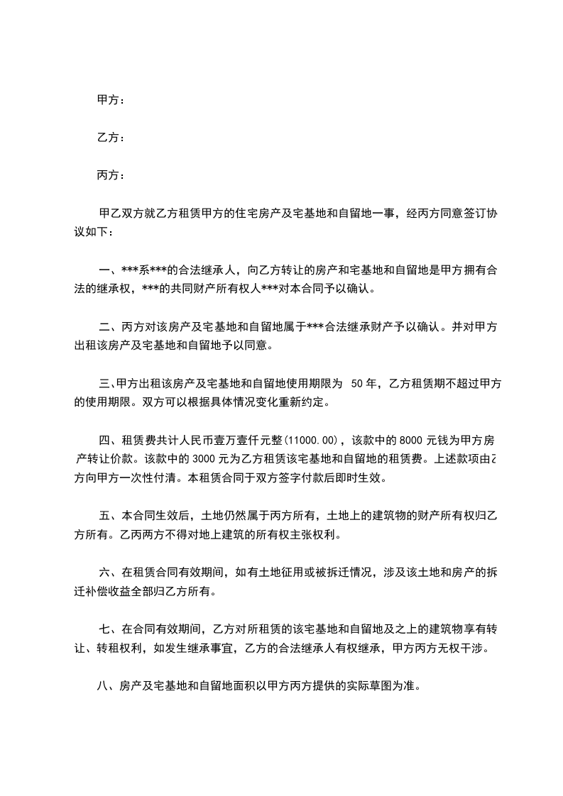 七、在合同有效期间,乙方对所租赁的该宅基地和自留地及之上的建筑物享有转让、转租权利,如发生继承事宜,乙方的合法继承人有权继承,甲方丙方无权干涉。
