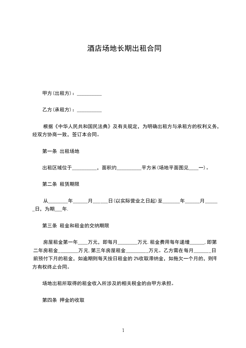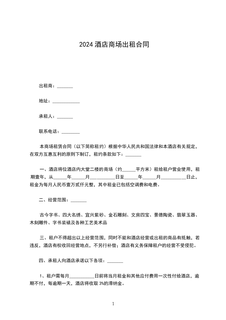 1.租户需于每月______日前将当月租金和其他应付费用一次性付给酒店,逾期不付,每逾期一天,酒店将收取3%的滞纳金。