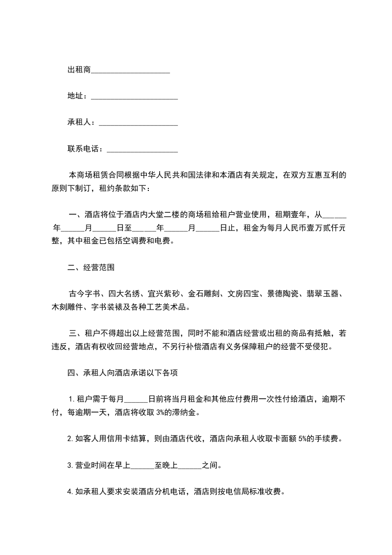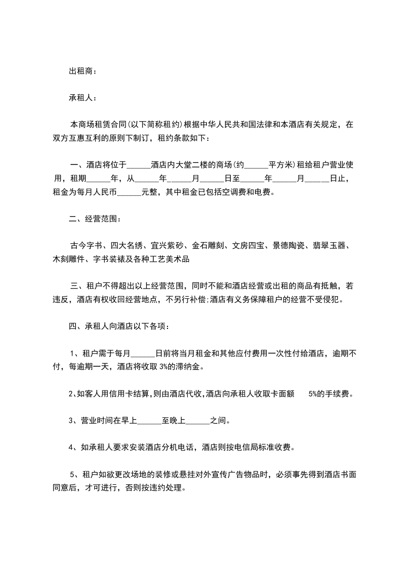 一、酒店将位于酒店内大堂二楼的商场租给租户营业使用,租期壹年,从______年______月______日至______年______月______日止,租金为每月人民币壹万贰仟元整,其中租金已包括空调费和电费。