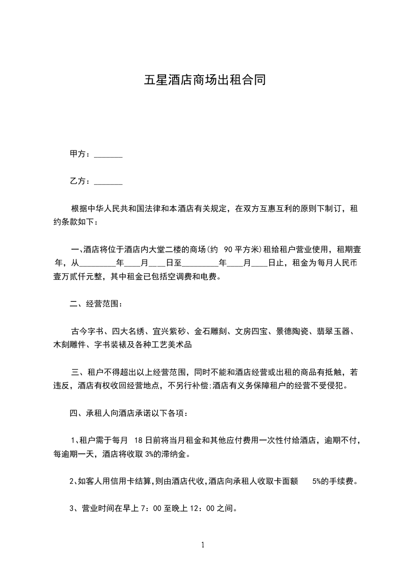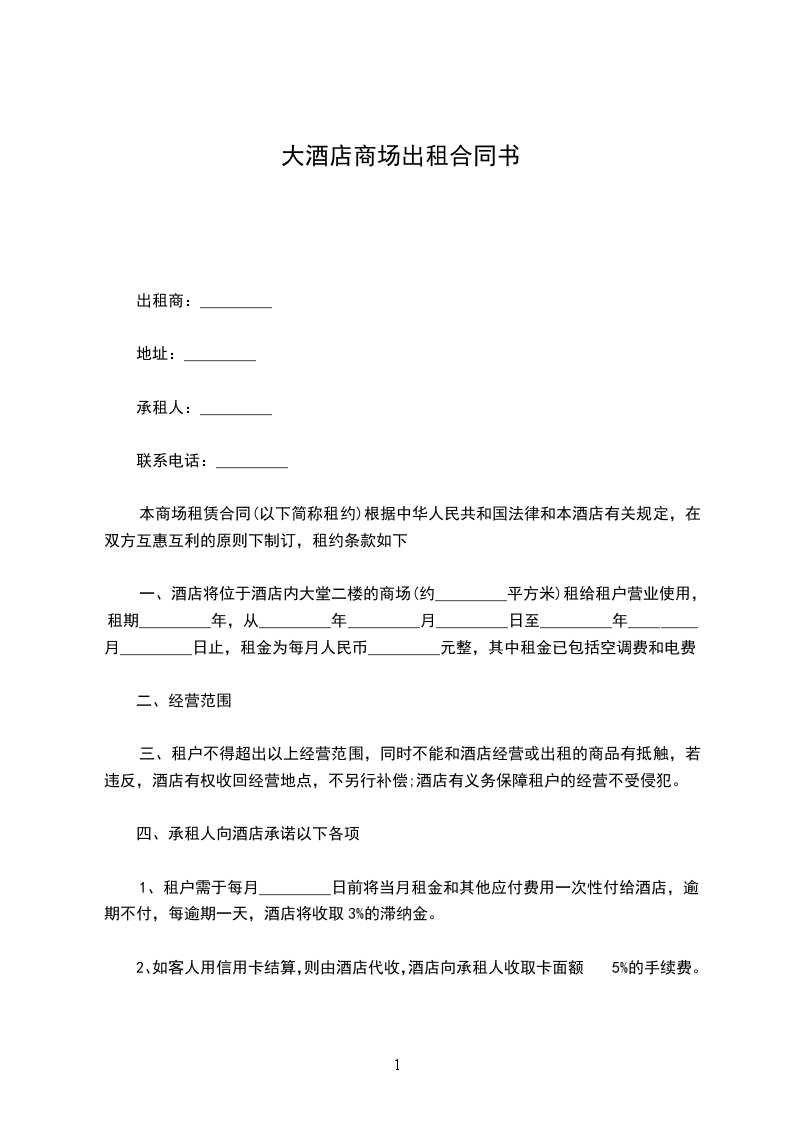本商场租赁合同根据中华人民共和国法律和本酒店有关规定,在双方互惠互利的原则下制订,租约条款如下: