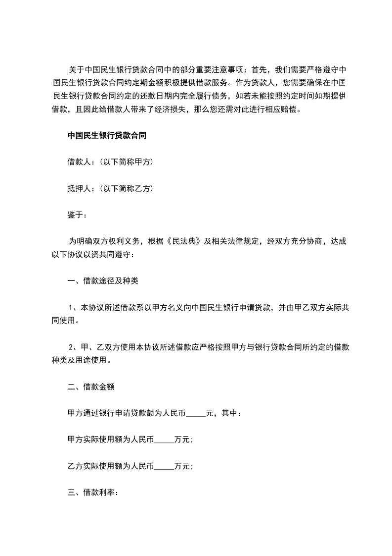 尊敬的客户,我们衷心地希望您能仔细阅读此份中国民生银行贷款合同的声明,以便对我行提供的贷款服务有更为全面和深入的了解。为了保护您的权益和利益,是一些特别需要注意的要点,敬请您细心参阅:,关于贷款金额:根据相关法规及合同规定,我行将按照中国民生银行贷款合同约定的金额向您提供贷款。在此过程中,我行会严格遵守相关法律法规,确保您获得公平公正的待遇。,关于利息支付方式:我行承诺,不会在贷款本金中预先扣除任何利息费用。如果发现有任何机构或个人在贷款本金中预先扣除利息,您有权要求按照实际借款金额进行还款,并按照实际借款金额计算利息。,关于还款计划:我行将与您共同制定合理的还款计划,以确保您能够按时履行还款义务。同时,我行也将为您提供必要的支持和帮助,以确保您顺利完成还款任务。,关于逾期处理:如您未能按期偿还贷款本息,我行将会采取适当的措施来维护自身合法权益。这些措施可能包括但不限于电话催信函通知等。,关于法律责任:我行提醒您,如您违反了上述条款中的任何一项,都可能导致严重的法律后果。因此,我们强烈建议您认真对待每一个条款,并严格遵守相关规定。,关于争议解决:如您与我行之间发生任何争议,我们鼓励您通过友好协商的方式加以解决。若协商无果,您可选择向当地法院提起诉讼。,关于联系方式:如您对中国民生银行贷款合同有任何疑问或需要进一步的帮助,欢迎随时拨打我行客服热线或发送电子邮件至指定邮箱。我们将竭诚为您解答疑惑,提供优质服务。最后,我们再次感谢您对我行的信任和支持。我们将继续努力提升服务质量,为广大客户提供更加便高安全的金融服务。祝您生活愉快!