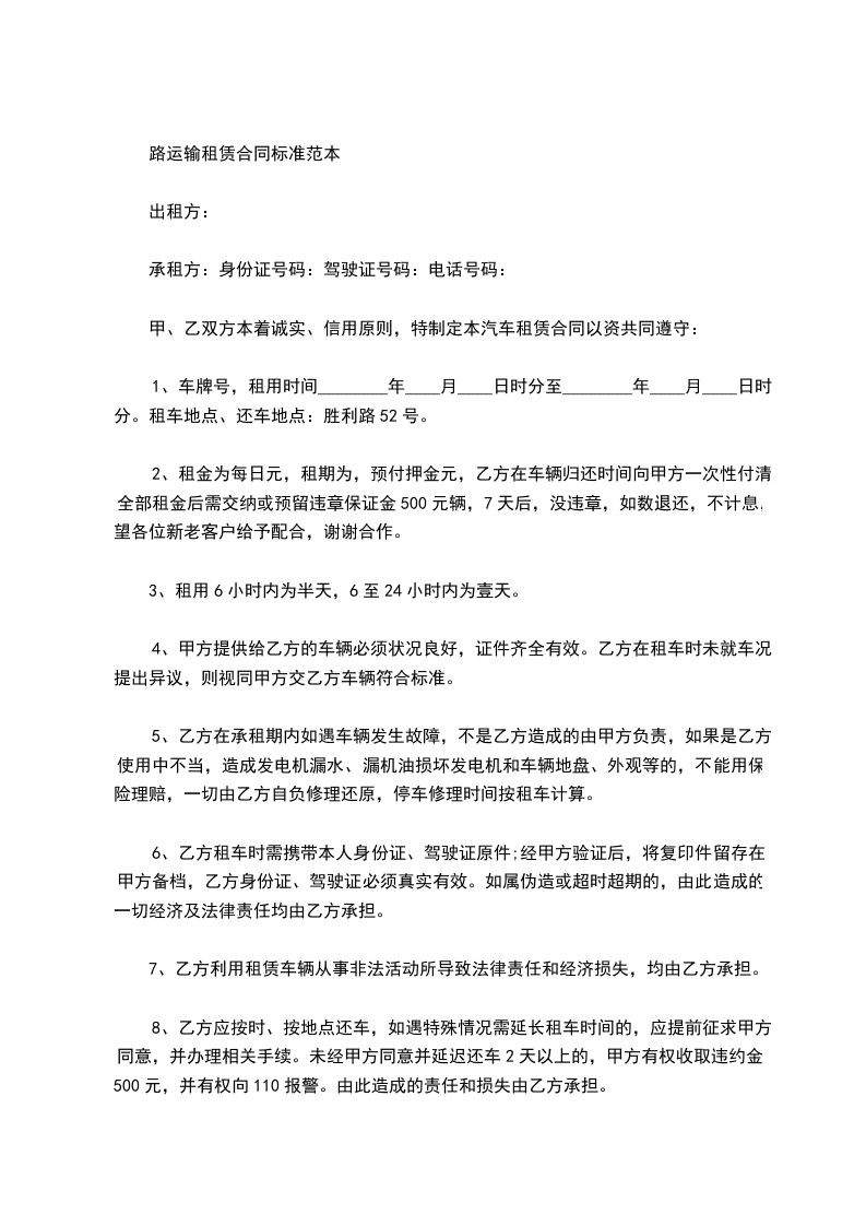 路运输租赁合同标准范本