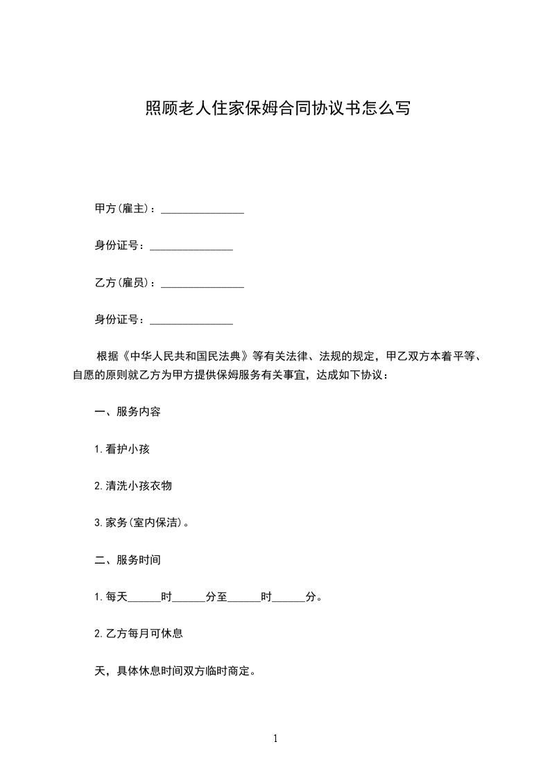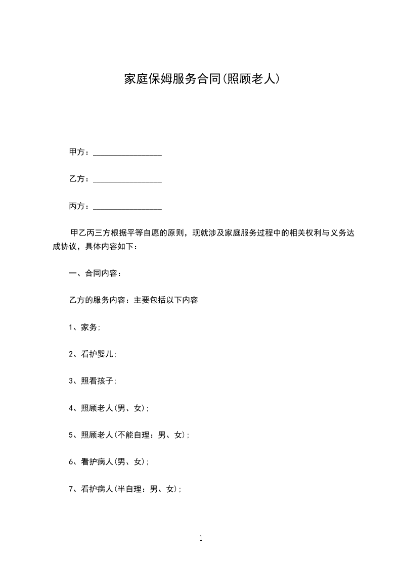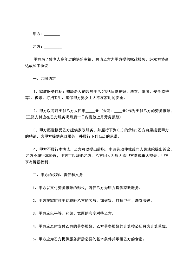 乙方从签定合同之日起至___年___月___日止,吃住在甲方家里,全天候24小时照顾老人。