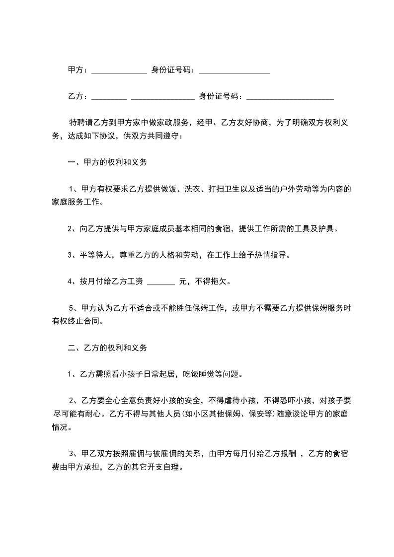 根据《中华人民共和国民法典》等有关法律、法规的规定,甲乙双方本着平等、自愿的原则就乙方为甲方提供保姆服务有关事宜,达成如下协议: