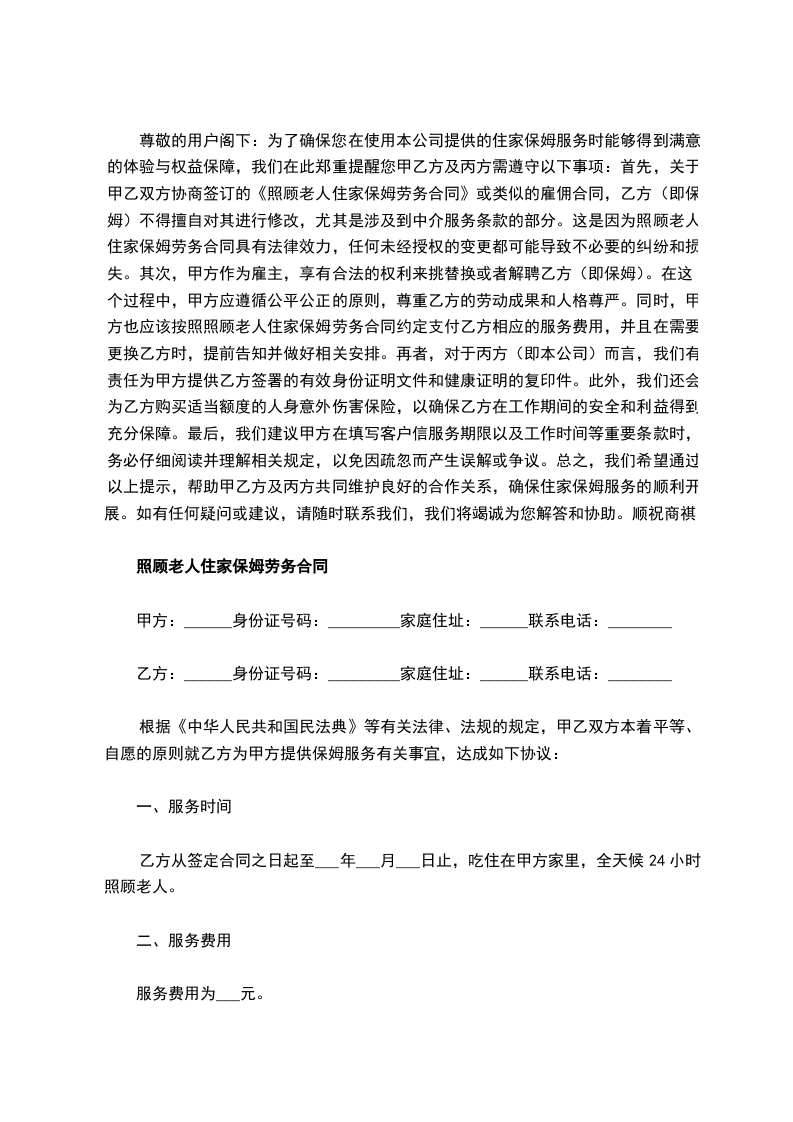 尊敬的用户阁下:为了确保您在使用本公司提供的住家保姆服务时能够得到满意的体验与权益保障,我们在此郑重提醒您甲乙方及丙方需遵守以下事项:首先,关于甲乙双方协商签订的《照顾老人住家保姆劳务合同》或类似的雇佣合同,乙方(即保姆)不得擅自对其进行修改,尤其是涉及到中介服务条款的部分。这是因为照顾老人住家保姆劳务合同具有法律效力,任何未经授权的变更都可能导致不必要的纠纷和损失。其次,甲方作为雇主,享有合法的权利来挑替换或者解聘乙方(即保姆)。在这个过程中,甲方应遵循公平公正的原则,尊重乙方的劳动成果和人格尊严。同时,甲方也应该按照照顾老人住家保姆劳务合同约定支付乙方相应的服务费用,并且在需要更换乙方时,提前告知并做好相关安排。再者,对于丙方(即本公司)而言,我们有责任为甲方提供乙方签署的有效身份证明文件和健康证明的复印件。此外,我们还会为乙方购买适当额度的人身意外伤害保险,以确保乙方在工作期间的安全和利益得到充分保障。最后,我们建议甲方在填写客户信服务期限以及工作时间等重要条款时,务必仔细阅读并理解相关规定,以免因疏忽而产生误解或争议。总之,我们希望通过以上提示,帮助甲乙方及丙方共同维护良好的合作关系,确保住家保姆服务的顺利开展。如有任何疑问或建议,请随时联系我们,我们将竭诚为您解答和协助。顺祝商祺!