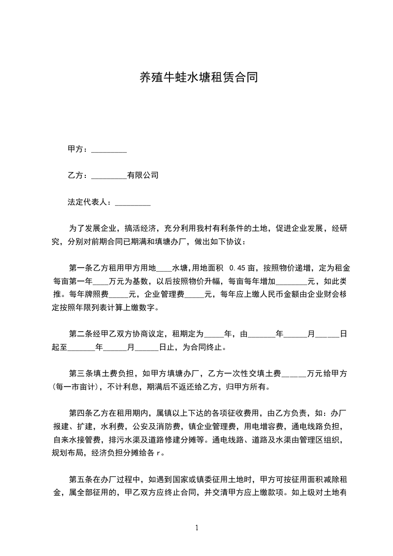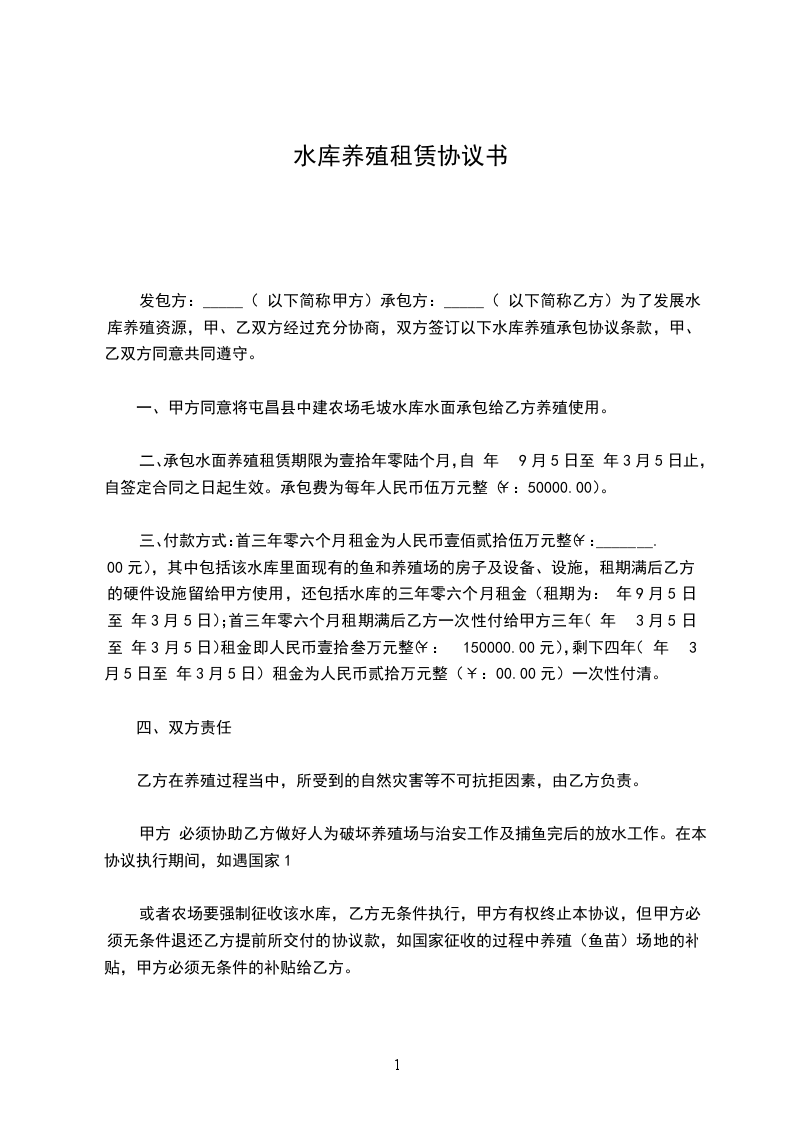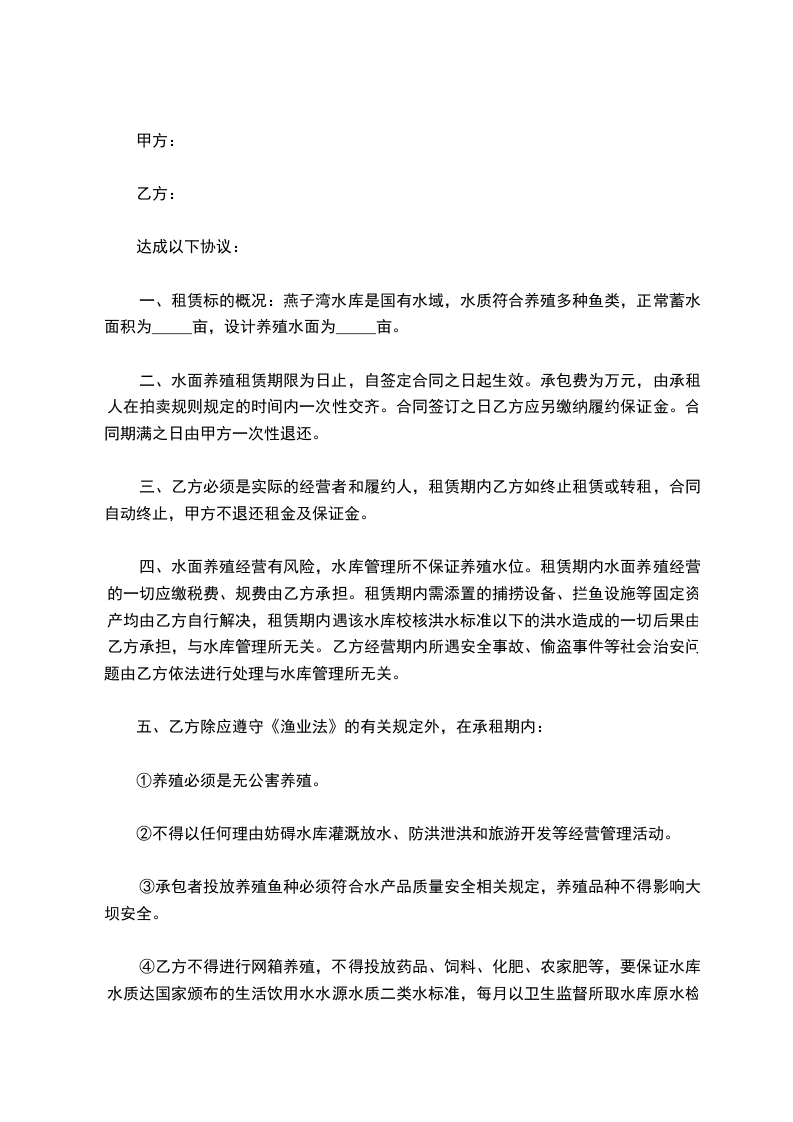 一、租赁标的概况:燕子湾水库是国有水域,水质符合养殖多种鱼类,正常蓄水面积为_____亩,设计养殖水面为_____亩。
