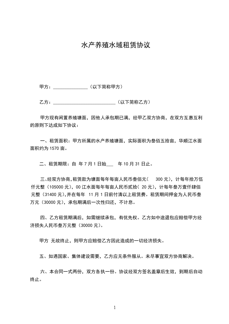 二、水面养殖租赁期限为日止,自签定合同之日起生效。承包费为万元,由承租人在拍卖规则规定的时间内一次性交齐。合同签订之日乙方应另缴纳履约保证金。合同期满之日由甲方一次性退还。