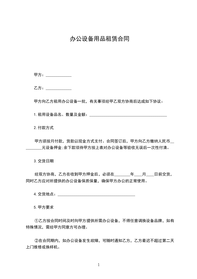 经双方协商,乙方在收到甲方押金后,必须在________年____月____日前交货,同时乙方应对所提供的办公设备保质保量,确保甲方办公的正常使用。