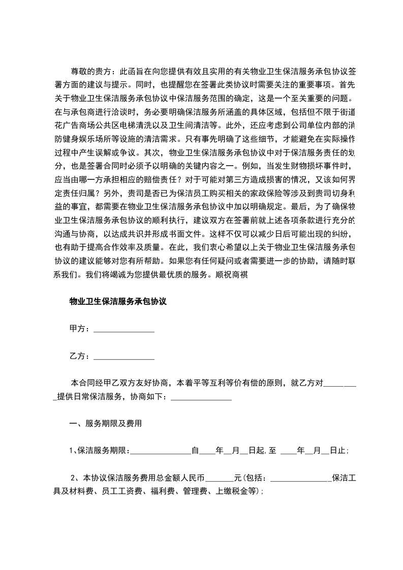 尊敬的贵方:此函旨在向您提供有效且实用的有关物业卫生保洁服务承包协议签署方面的建议与提示。同时,也提醒您在签署此类协议时需要关注的重要事项。首先,关于物业卫生保洁服务承包协议中保洁服务范围的确定,这是一个至关重要的问题。在与承包商进行洽谈时,务必要明确保洁服务所涵盖的具体区域,包括但不限于街道花广告商场公共区电梯清洗以及卫生间清洁等。此外,还应考虑到公司单位内部的消防健身娱乐场所等设施的清洁需求。只有事先明确了这些细节,才能避免在实际操作过程中产生误解或争议。其次,物业卫生保洁服务承包协议中对于保洁服务责任的划分,也是签署合同时必须予以明确的关键内容之一。例如,当发生财物损坏事件时,应当由哪一方承担相应的赔偿责任?对于可能对第三方造成损害的情况,又该如何界定责任归属?另外,贵司是否已为保洁员工购买相关的家政保险等涉及到贵司切身利益的事宜,都需要在物业卫生保洁服务承包协议中加以明确规定。最后,为了确保物业卫生保洁服务承包协议的顺利执行,建议双方在签署前就上述各项条款进行充分的沟通与协商,以达成共识并形成书面文件。这样不仅可以减少日后可能出现的纠纷,也有助于提高合作效率及质量。在此,我们衷心希望以上关于物业卫生保洁服务承包协议的建议能够对您有所帮助。如果您有任何疑问或者需要进一步的协助,请随时联系我们。我们将竭诚为您提供最优质的服务。顺祝商祺