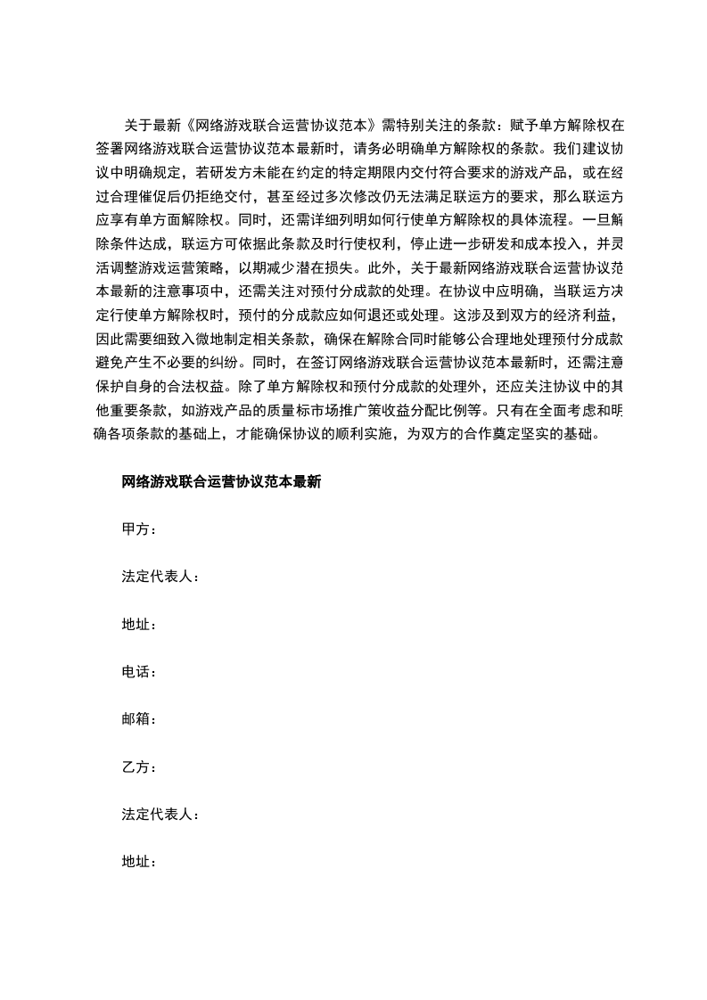 关于最新《网络游戏联合运营协议范本》需特别关注的条款:赋予单方解除权在签署网络游戏联合运营协议范本最新时,请务必明确单方解除权的条款。我们建议协议中明确规定,若研发方未能在约定的特定期限内交付符合要求的游戏产品,或在经过合理催促后仍拒绝交付,甚至经过多次修改仍无法满足联运方的要求,那么联运方应享有单方面解除权。同时,还需详细列明如何行使单方解除权的具体流程。一旦解除条件达成,联运方可依据此条款及时行使权利,停止进一步研发和成本投入,并灵活调整游戏运营策略,以期减少潜在损失。此外,关于最新网络游戏联合运营协议范本最新的注意事项中,还需关注对预付分成款的处理。在协议中应明确,当联运方决定行使单方解除权时,预付的分成款应如何退还或处理。这涉及到双方的经济利益,因此需要细致入微地制定相关条款,确保在解除合同时能够公合理地处理预付分成款,避免产生不必要的纠纷。同时,在签订网络游戏联合运营协议范本最新时,还需注意保护自身的合法权益。除了单方解除权和预付分成款的处理外,还应关注协议中的其他重要条款,如游戏产品的质量标市场推广策收益分配比例等。只有在全面考虑和明确各项条款的基础上,才能确保协议的顺利实施,为双方的合作奠定坚实的基础。