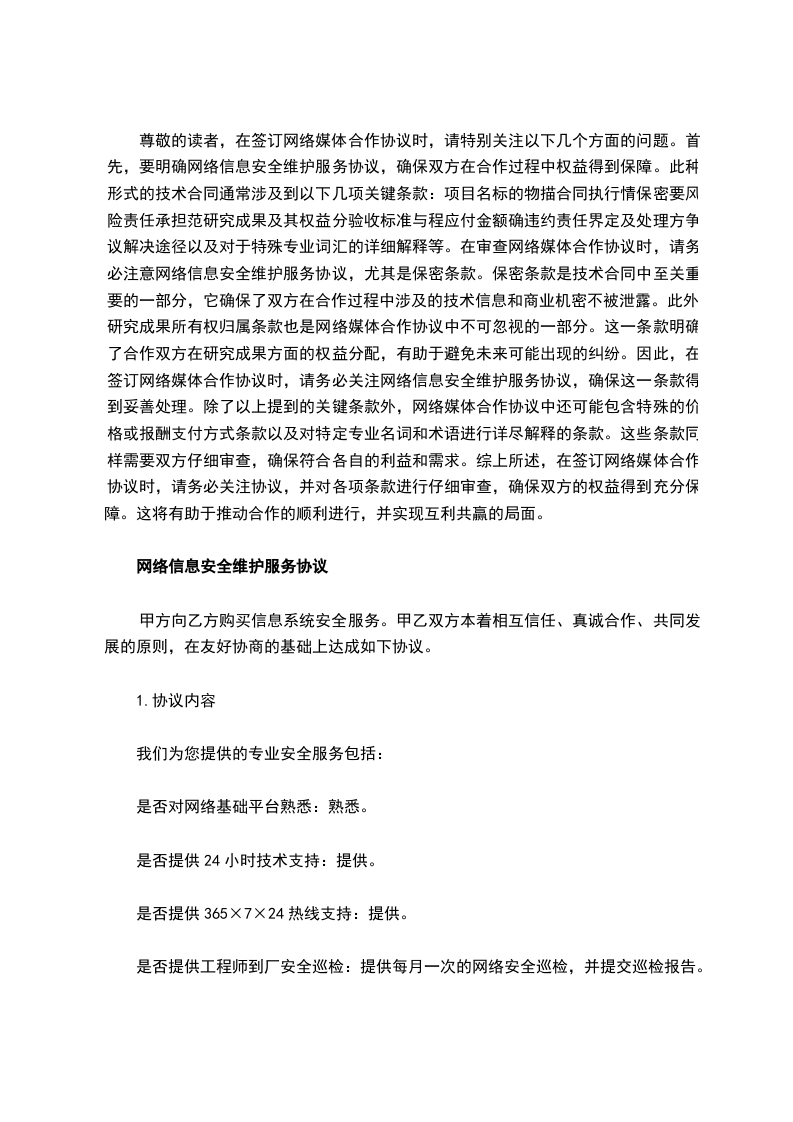 尊敬的读者,在签订网络媒体合作协议时,请特别关注以下几个方面的问题。首先,要明确网络信息安全维护服务协议,确保双方在合作过程中权益得到保障。此种形式的技术合同通常涉及到以下几项关键条款:项目名标的物描合同执行情保密要风险责任承担范研究成果及其权益分验收标准与程应付金额确违约责任界定及处理方争议解决途径以及对于特殊专业词汇的详细解释等。在审查网络媒体合作协议时,请务必注意网络信息安全维护服务协议,尤其是保密条款。保密条款是技术合同中至关重要的一部分,它确保了双方在合作过程中涉及的技术信息和商业机密不被泄露。此外,研究成果所有权归属条款也是网络媒体合作协议中不可忽视的一部分。这一条款明确了合作双方在研究成果方面的权益分配,有助于避免未来可能出现的纠纷。因此,在签订网络媒体合作协议时,请务必关注网络信息安全维护服务协议,确保这一条款得到妥善处理。除了以上提到的关键条款外,网络媒体合作协议中还可能包含特殊的价格或报酬支付方式条款以及对特定专业名词和术语进行详尽解释的条款。这些条款同样需要双方仔细审查,确保符合各自的利益和需求。综上所述,在签订网络媒体合作协议时,请务必关注协议,并对各项条款进行仔细审查,确保双方的权益得到充分保障。这将有助于推动合作的顺利进行,并实现互利共赢的局面。