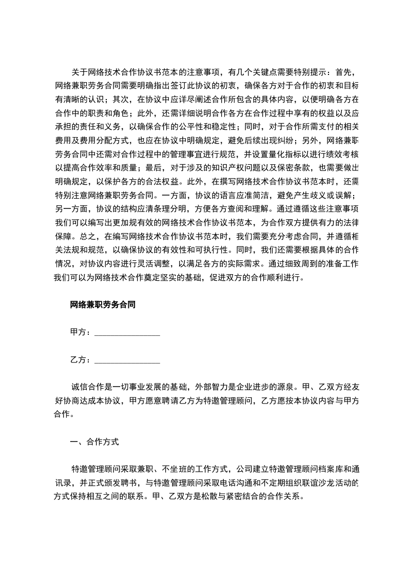 关于网络技术合作协议书范本的注意事项,有几个关键点需要特别提示:首先,网络兼职劳务合同需要明确指出签订此协议的初衷,确保各方对于合作的初衷和目标有清晰的认识;其次,在协议中应详尽阐述合作所包含的具体内容,以便明确各方在合作中的职责和角色;此外,还需详细说明合作各方在合作过程中享有的权益以及应承担的责任和义务,以确保合作的公平性和稳定性;同时,对于合作所需支付的相关费用及费用分配方式,也应在协议中明确规定,避免后续出现纠纷;另外,网络兼职劳务合同中还需对合作过程中的管理事宜进行规范,并设置量化指标以进行绩效考核,以提高合作效率和质量;最后,对于涉及的知识产权问题以及保密条款,也需要做出明确规定,以保护各方的合法权益。此外,在撰写网络技术合作协议书范本时,还需特别注意网络兼职劳务合同。一方面,协议的语言应准简洁,避免产生歧义或误解;另一方面,协议的结构应清条理分明,方便各方查阅和理解。通过遵循这些注意事项,我们可以编写出更加规有效的网络技术合作协议书范本,为合作双方提供有力的法律保障。总之,在编写网络技术合作协议书范本时,我们需要充分考虑合同,并遵循相关法规和规范,以确保协议的有效性和可执行性。同时,我们还需要根据具体的合作情况,对协议内容进行灵活调整,以满足各方的实际需求。通过细致周到的准备工作,我们可以为网络技术合作奠定坚实的基础,促进双方的合作顺利进行。