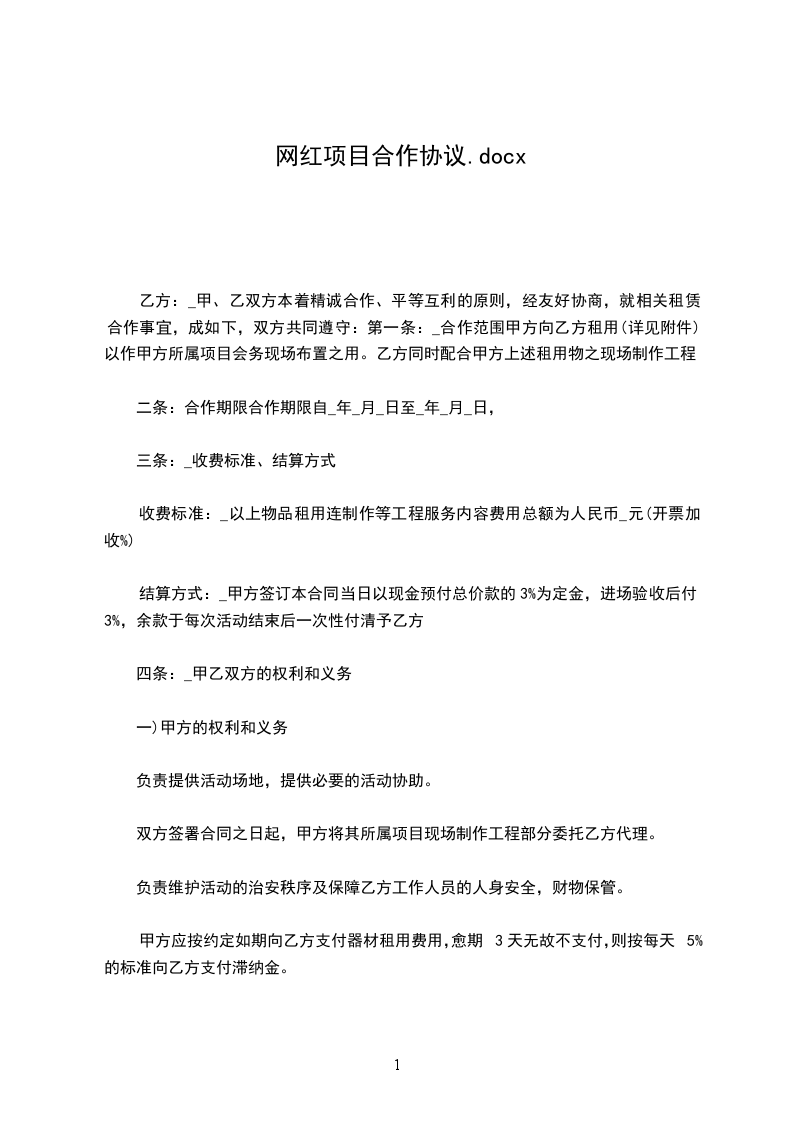第三条有效期从_______年_____月____日至_______年_____月_____日,由签约日计。除非本协议提前终止,乙方可在协议有效期满前三个月向甲方提出延长协议合作的书面请求,经甲方同意,可以续签《__网红项目________合作协议书》。
