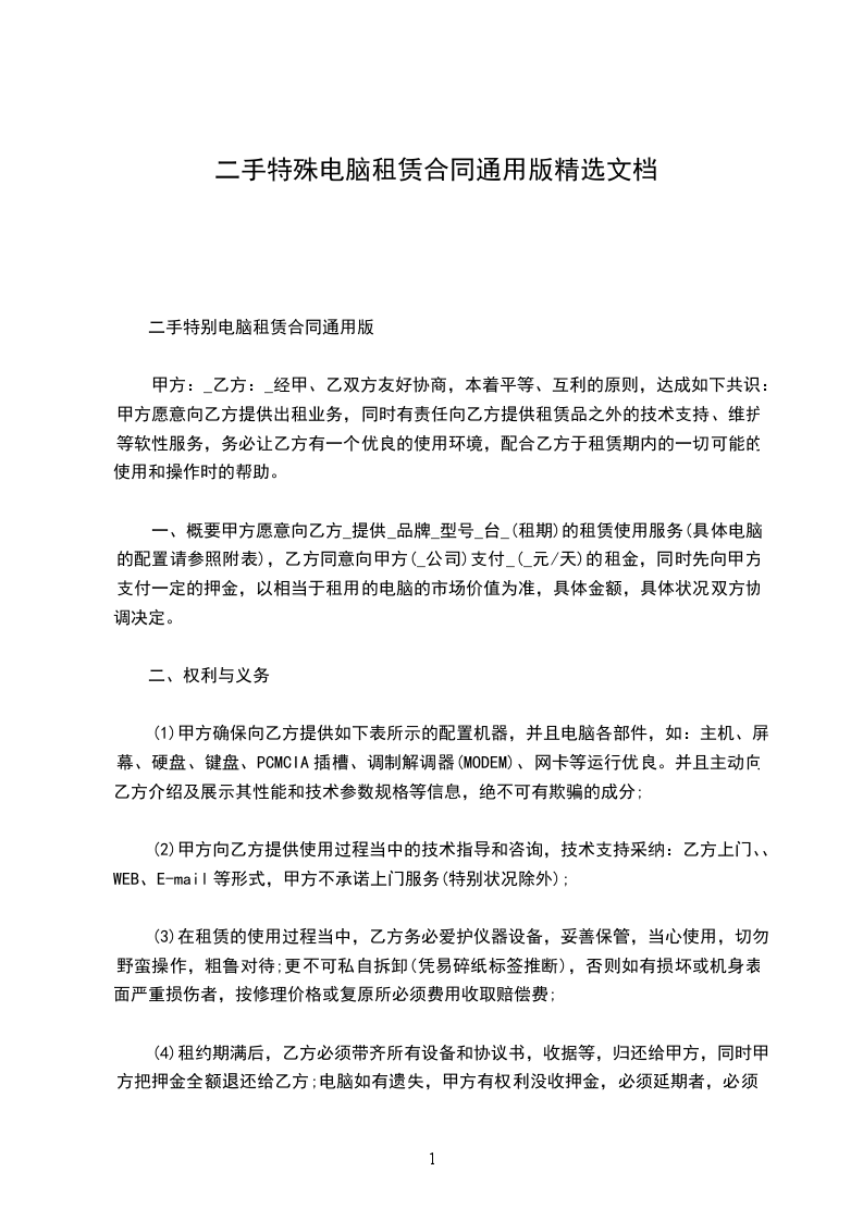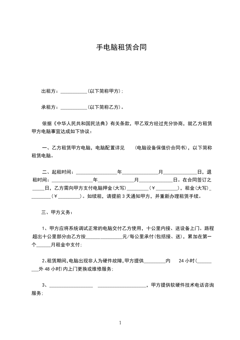 依据《中华人民共和国民法典》有关条款,甲乙双方经过充分协商,就甲方租赁乙方电脑及相关设备等事宜达成如下协议: