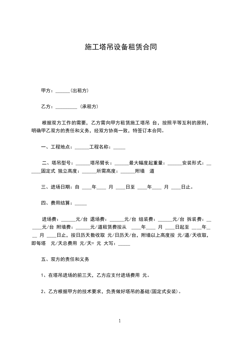 因工程施工需要,甲方租赁乙方塔吊_________台投入到_________工程施工,为明确双方的责任、权利及义务,经双方友好协商,一致同意签订本塔吊起重机租赁合同一份。