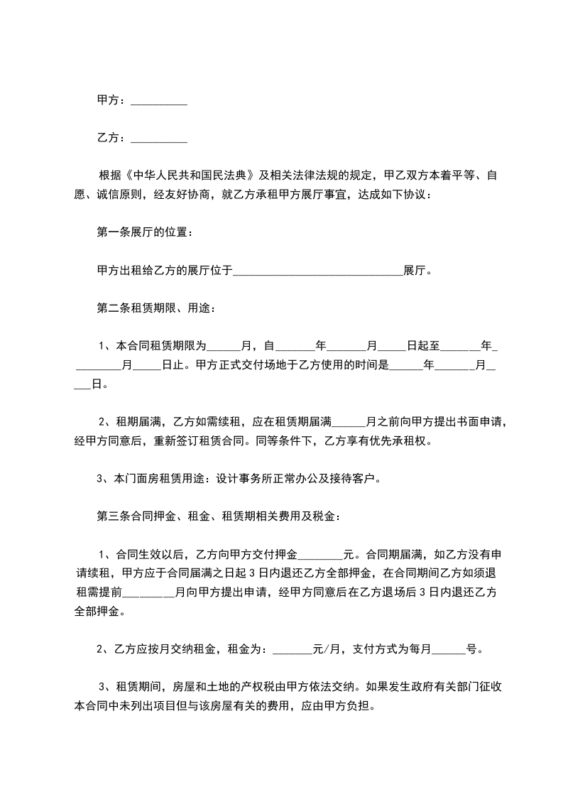 根据《中华人民共和国民法典》及相关法律法规的规定,甲乙双方本着平等、自愿、诚信原则,经友好协商,就乙方承租甲方展厅事宜,达成如下协议: