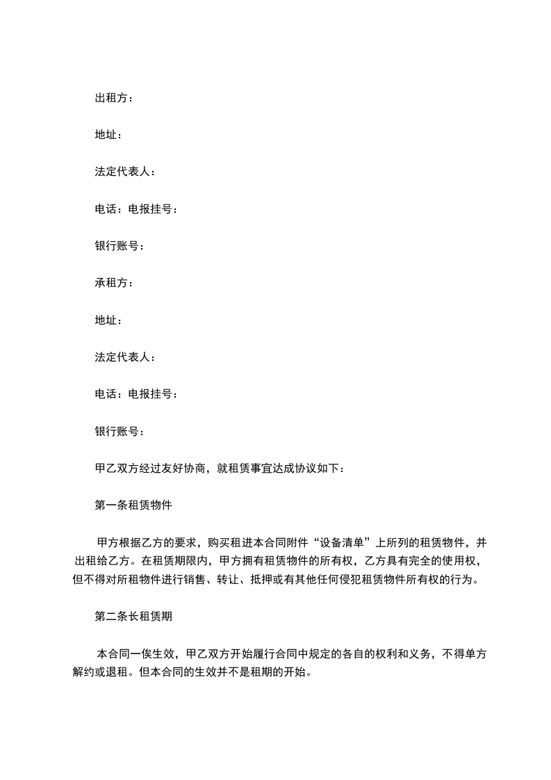 甲方根据乙方的要求,购买租进本合同附件“设备清单”上所列的租赁物件,并出租给乙方。在租赁期限内,甲方拥有租赁物件的所有权,乙方具有完全的使用权,但不得对所租物件进行销售、转让、抵押或有其他任何侵犯租赁物件所有权的行为。