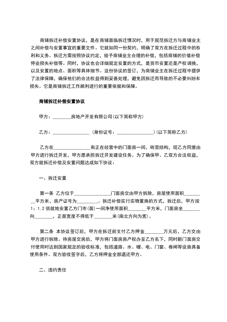 乙方在________________有正在经营中的门面房一间,砖混结构,现乙方同意由甲方进行拆迁开发,甲方愿承担拆迁开发建设任务。为了确保甲、乙双方合法权益,双方就拆迁补偿及安置问题达成如下协议: