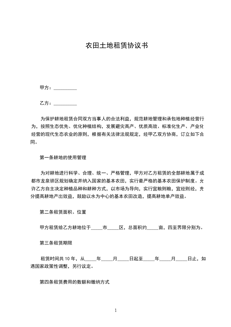为保护耕地租赁合同双方当事人的合法利益,规范耕地管理和承包地种植经营行为,按照生态优先、优化种植结构,发展避灾高产、优质高效、标准化生产、产业化经营的现代生态农业的原则,根据有关法律法规规定,经甲乙双方协商,订立如下合同。
