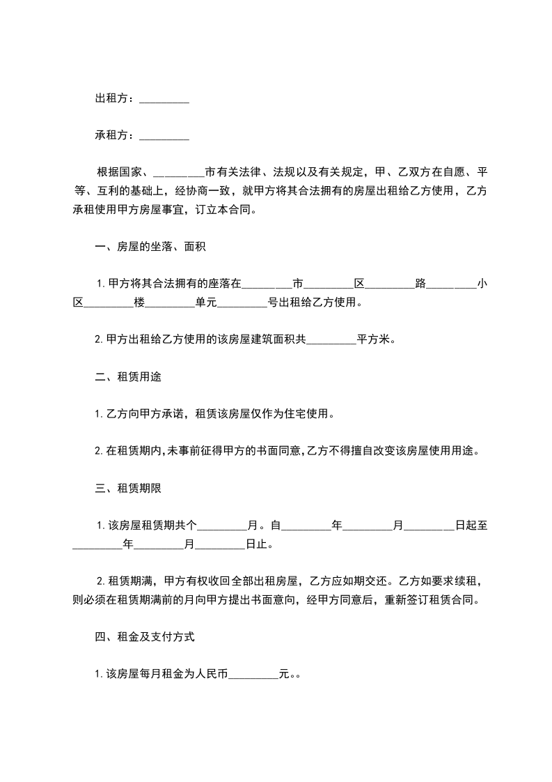 1.甲方将其合法拥有的座落在_________市_________区_________路_________小区_________楼_________单元_________号出租给乙方使用。